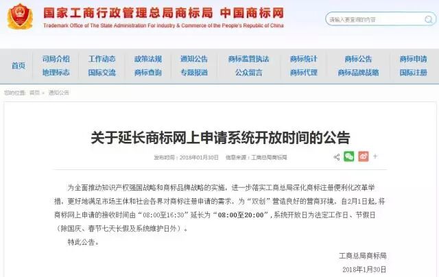 为全面推动知识产权强国战略和商标品牌战略的实施,进一步落实工商总局深化商标注册便利化改革举措,更好地满足市场主体和社会各界对商标注册申请的需求,为“双创”营造良好的营商环境,自2月1日起,将商标网上申请的接收时间由“08:00至16:30”延长为“08:00至20:00”,系统开放日为法定工作日、节假日(除国庆、春节七天长假及系统维护日外)。